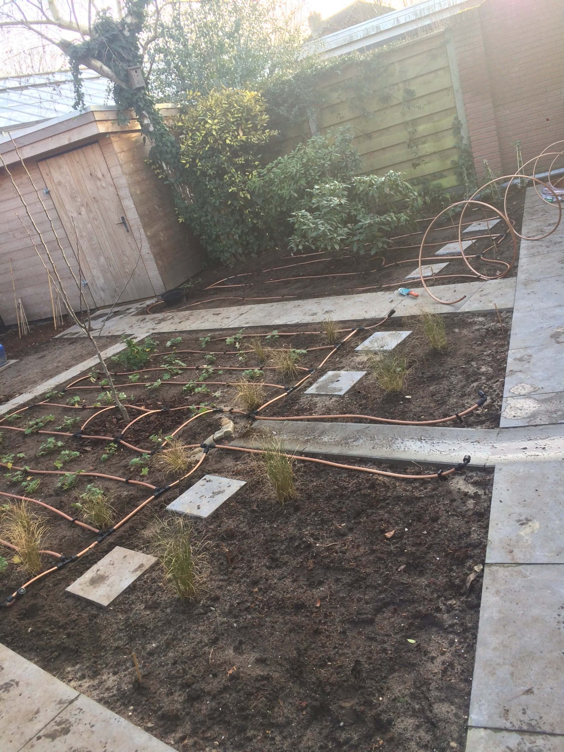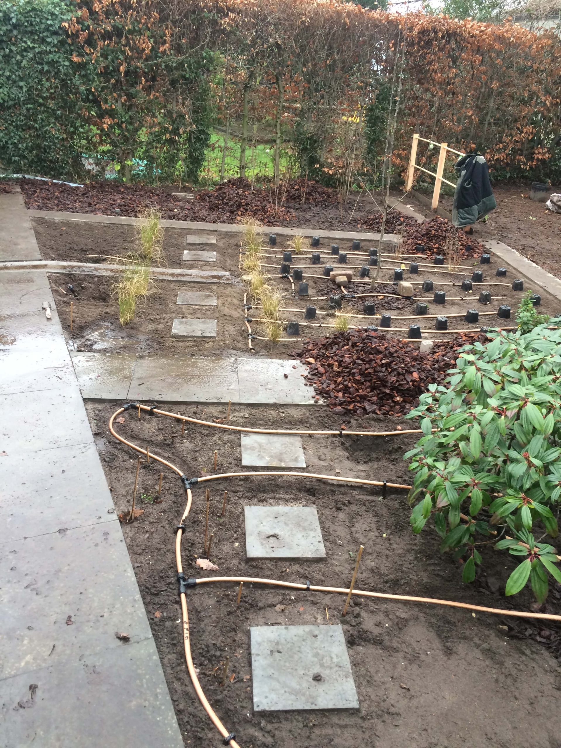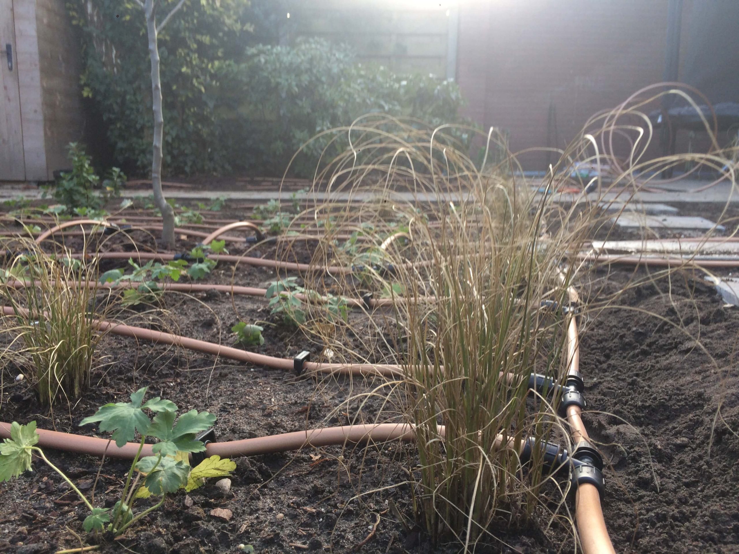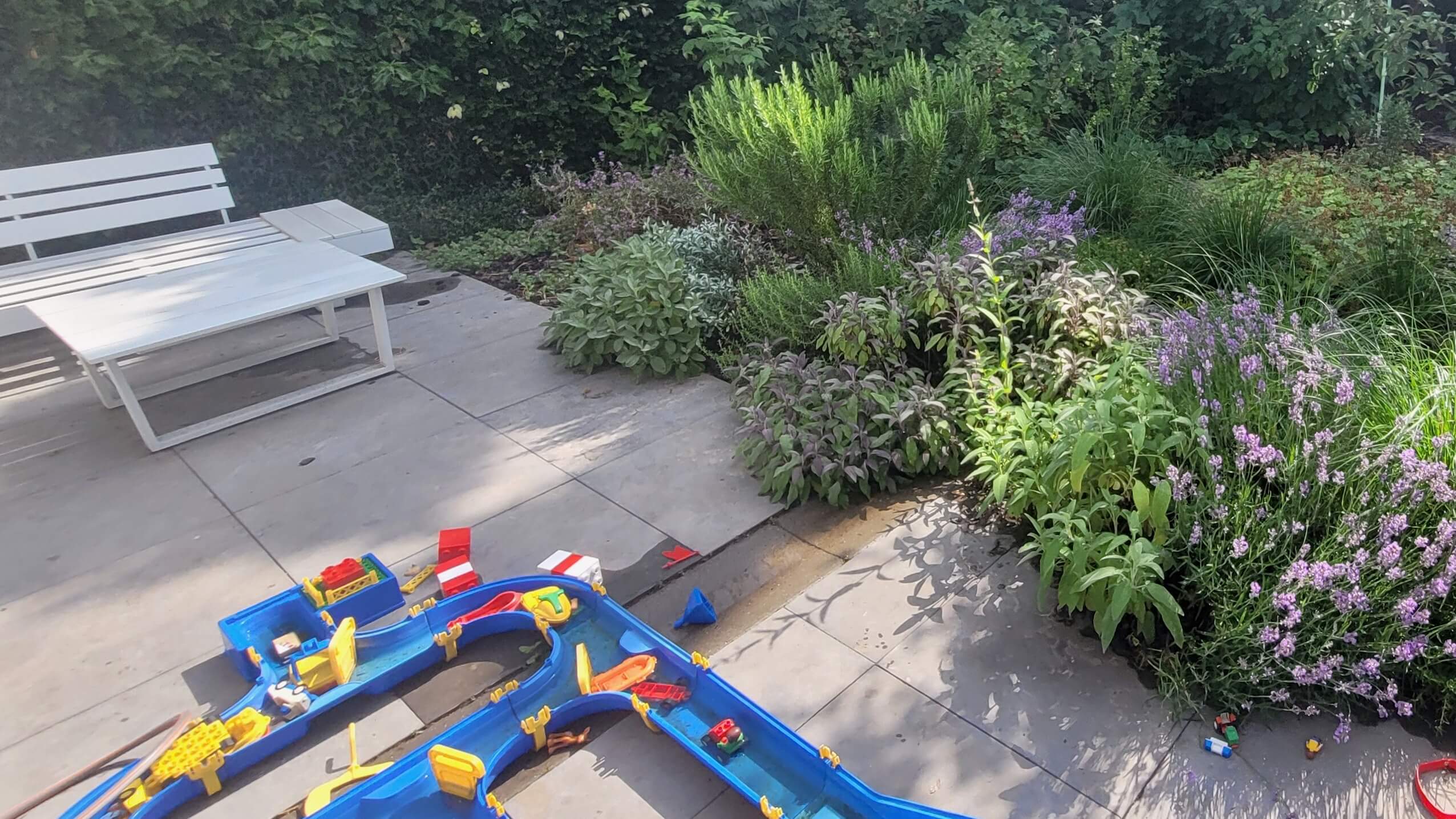 Vanuit drie regenpijpen wordt het water drie verlaagde zone’s in geleid.